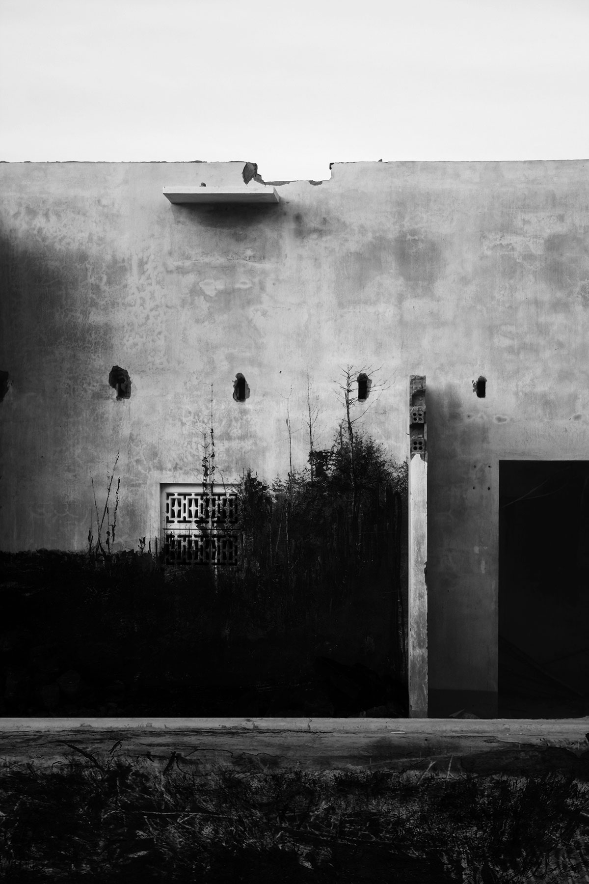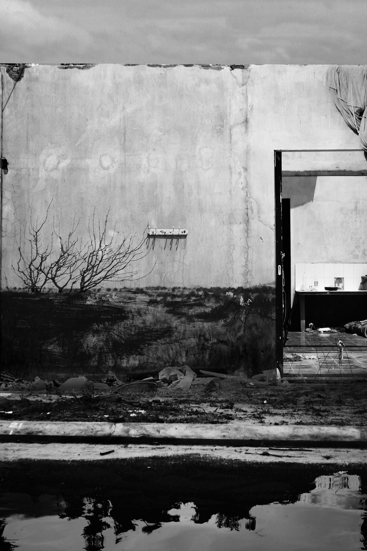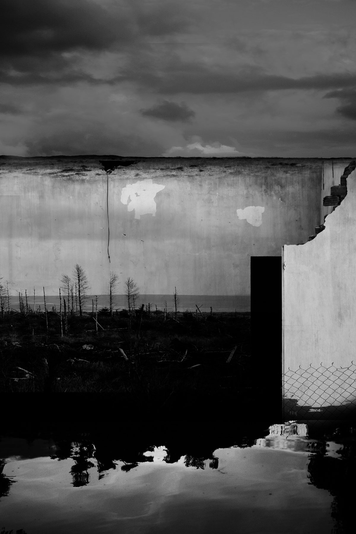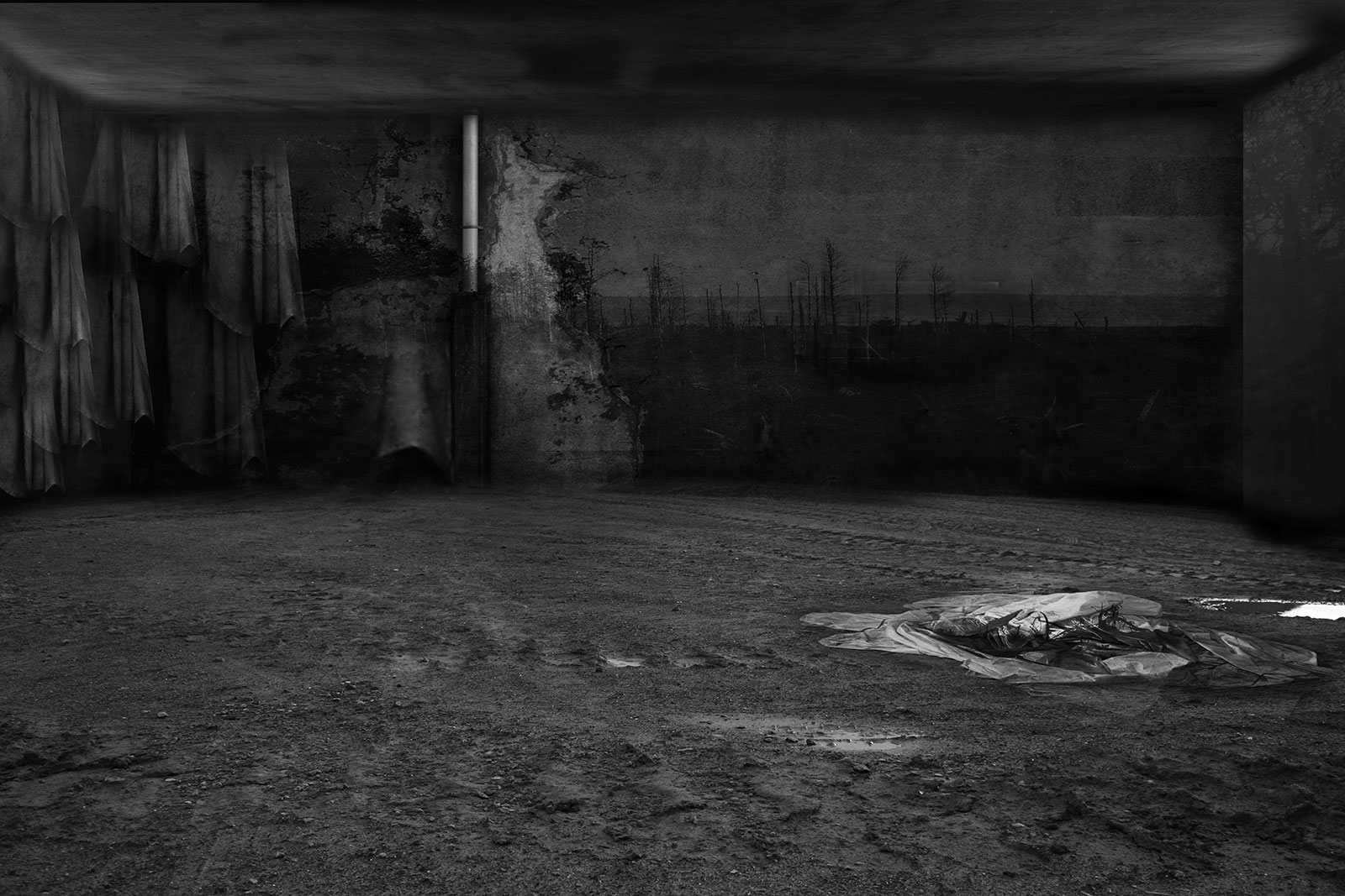 Aftermath and Perimeter combine original imagery gathered from Vietnam, Cambodia and the west of Ireland. These are then physically worked into using ink and paint to create imagery resembling painted stage sets, with surface and depth becoming uncertain.