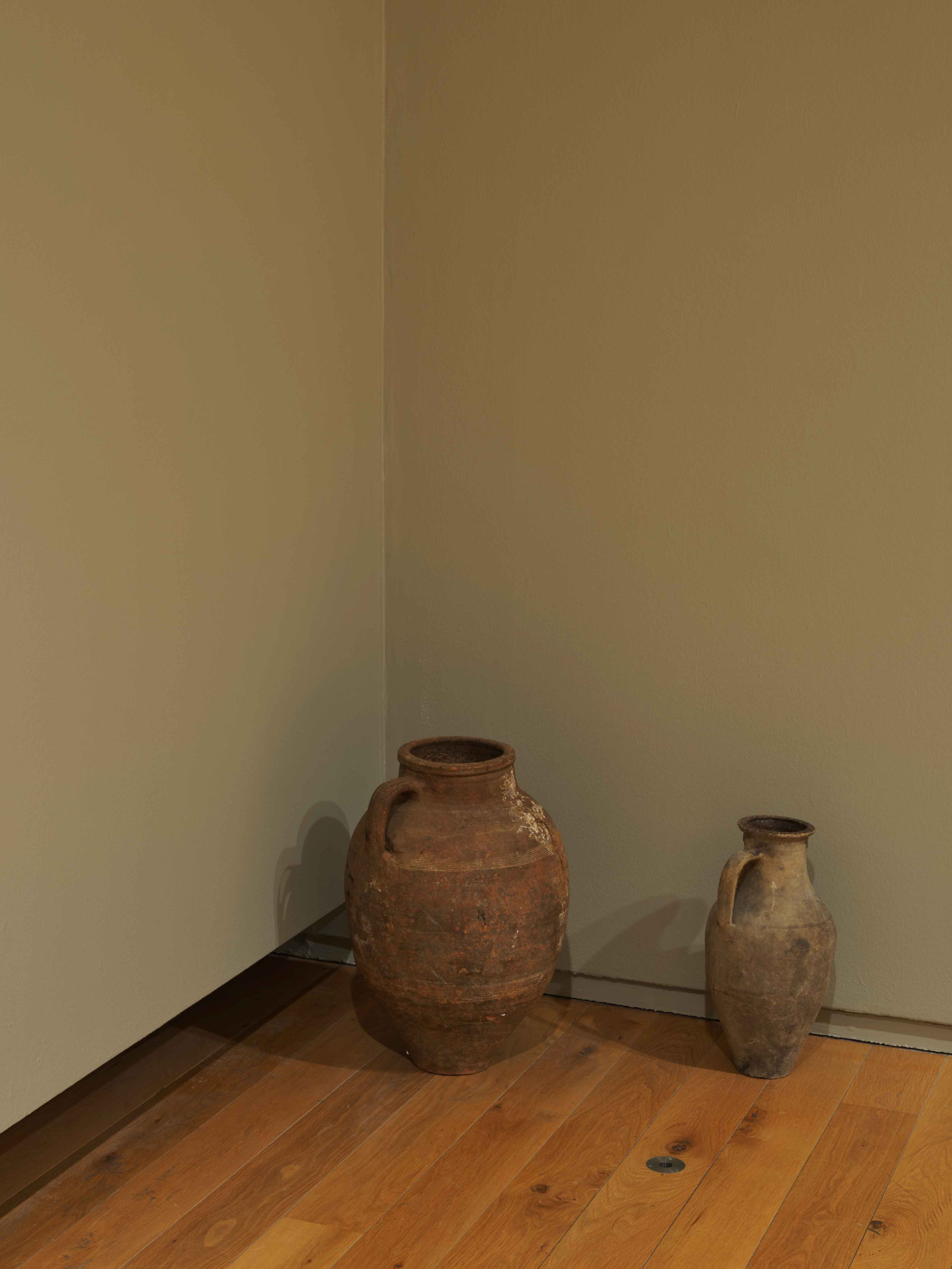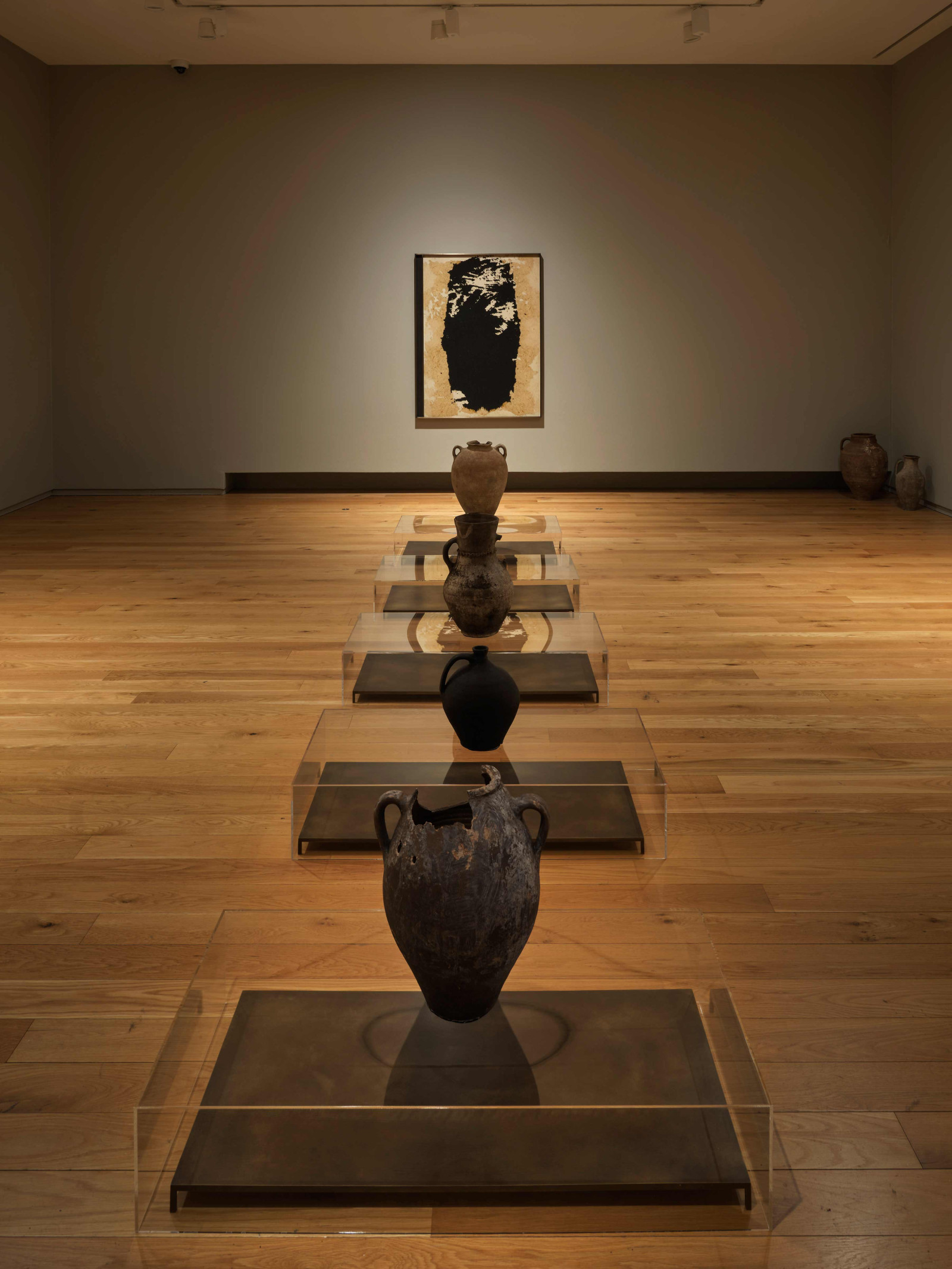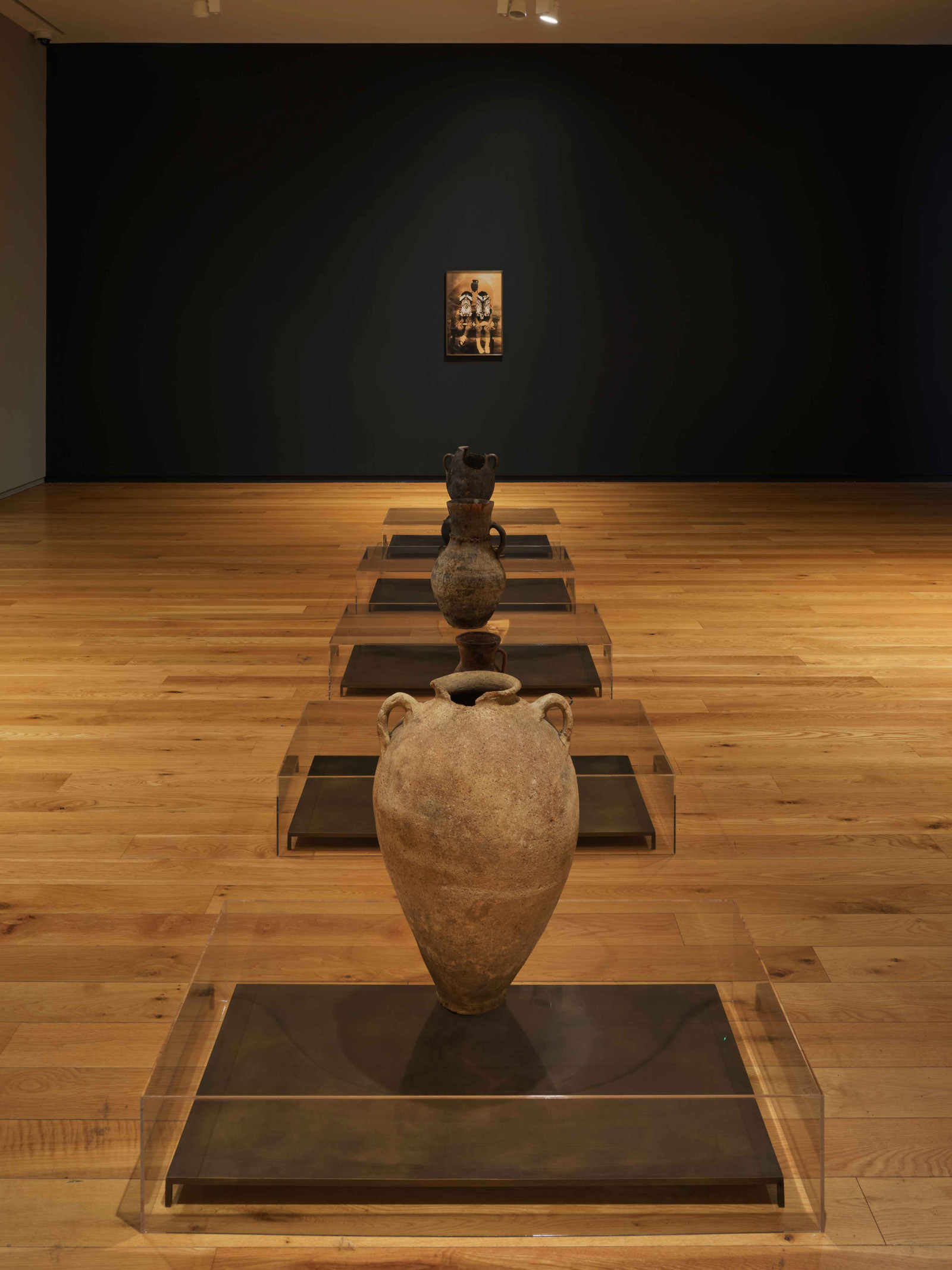 of found ceramic vessels, arranged in a manner that at once suggests and confounds museological display. No longer protected by their enclosures, they appear vulnerable yet animate—objects dislodged from systems of classification and returned to a state of uncertainty. In this quiet undoing of order and preservation, the work gestures toward the instability of cultural memory and the fragile architectures through which we attempt to contain it.