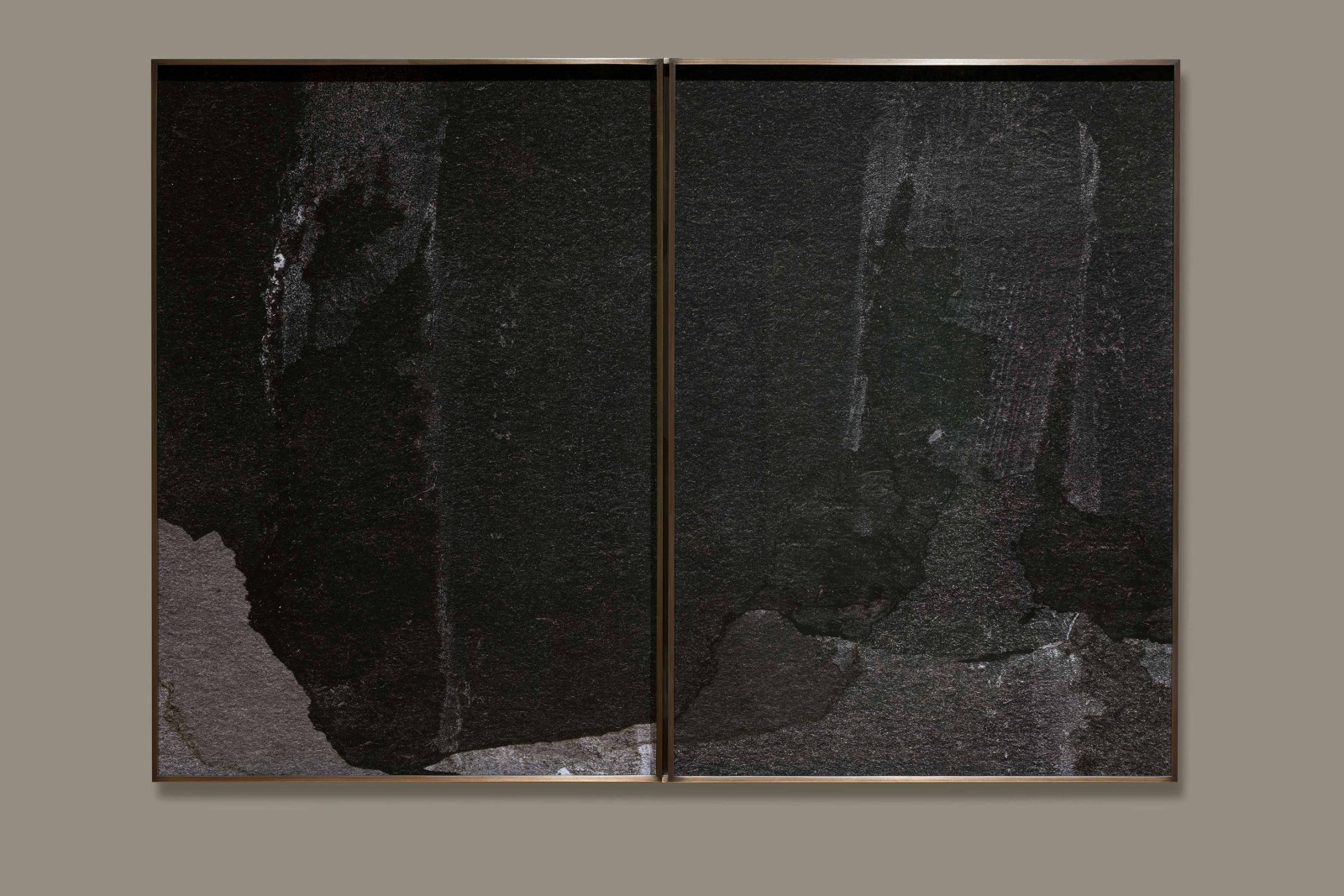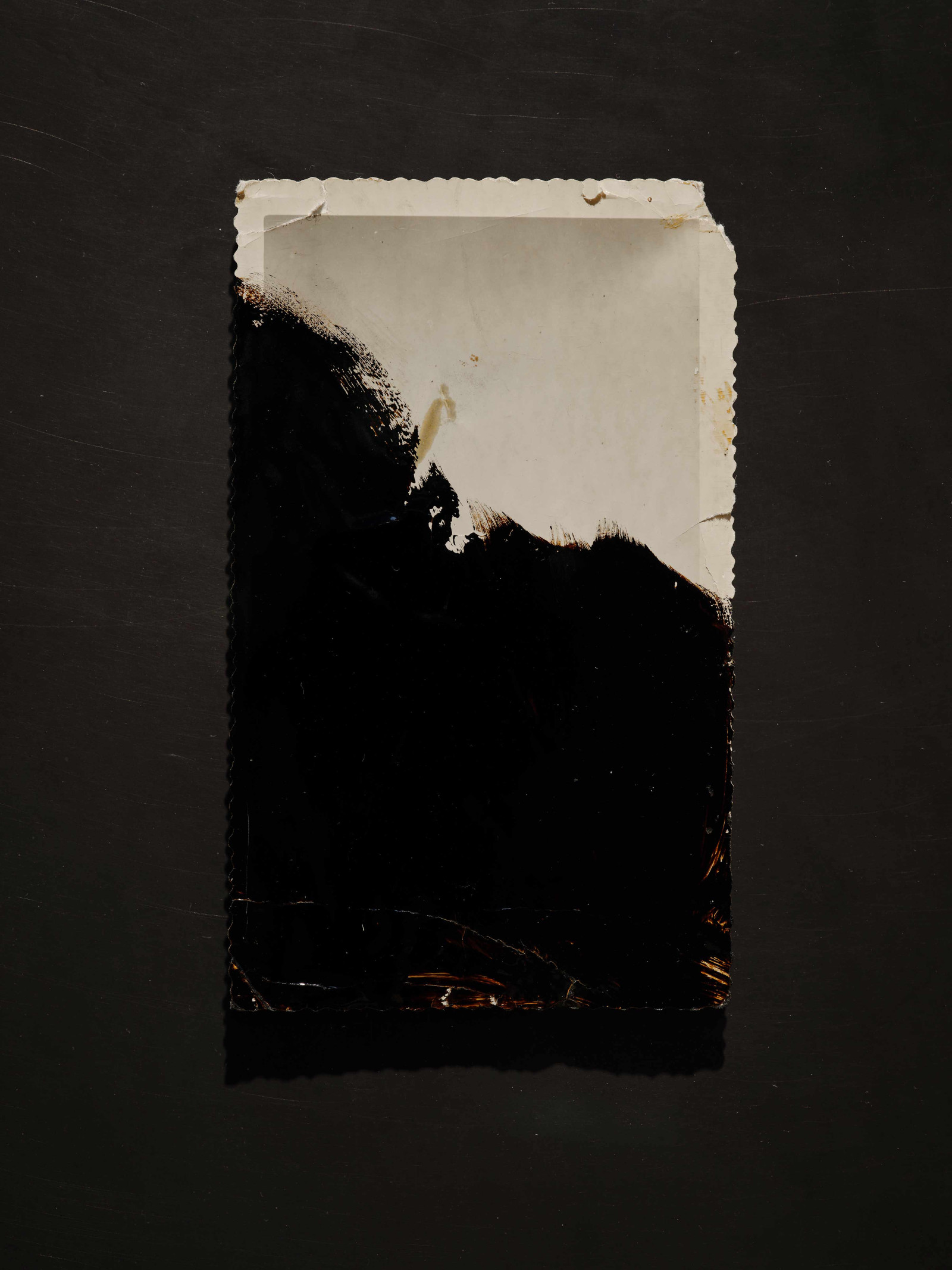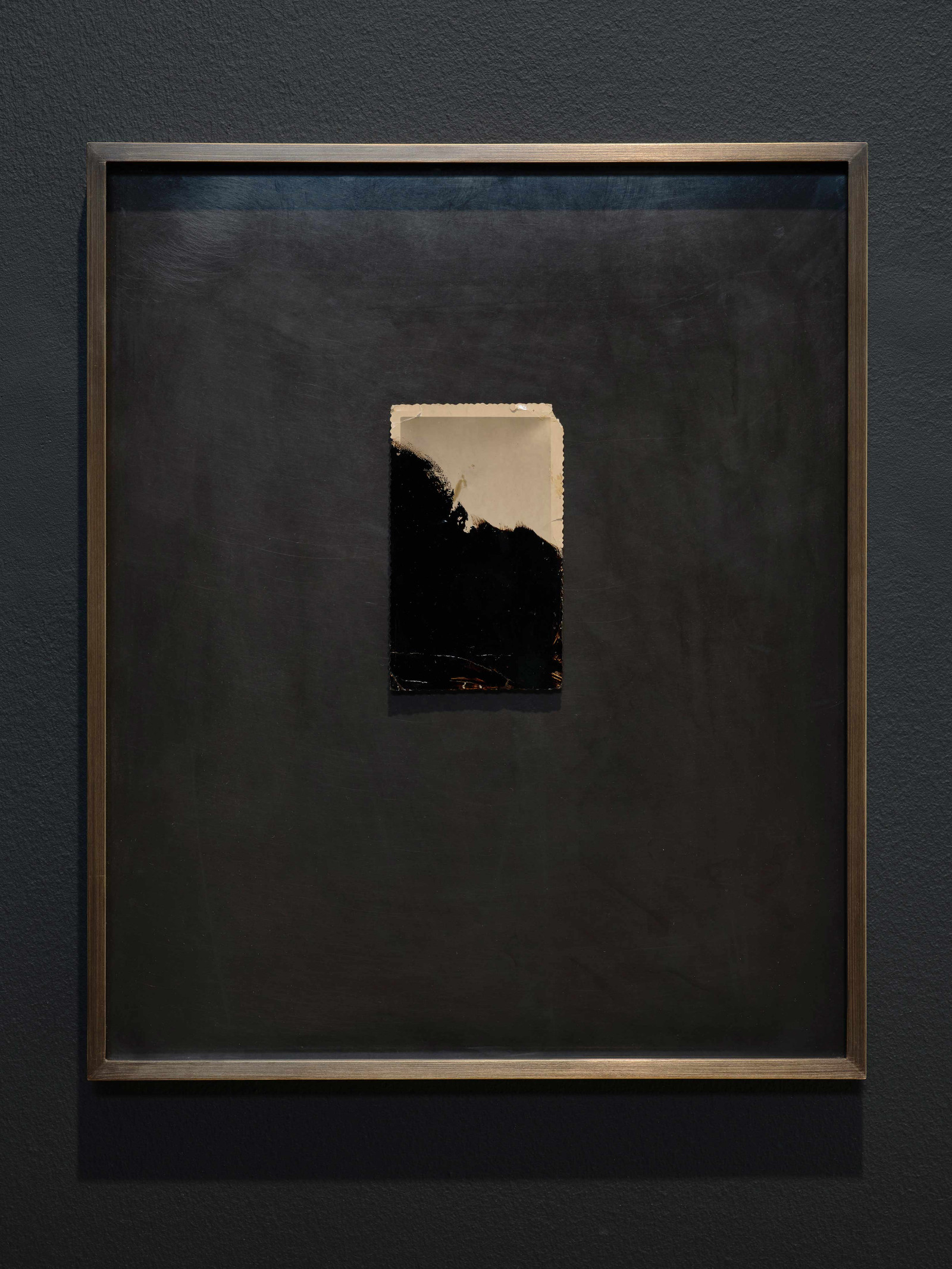 This body of abstract prints and objects approaches the archive through ideas of absence and erasure. In Untitled (Surface #6) a found photograph is obscured with bitumen, while the Picture series depicts the reverse sides of early photographic prints. Reworked in places by hand and set in custom brass frames that echo margins and book spines, they resemble fragments from a future archive where only traces of photographs remain. These works shift the photograph’s meaning away from record and evidence, towards the symbolic and speculative - shaped less by what was preserved than by the gaps of memory and loss.